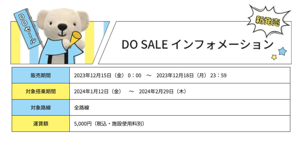 期間は12月15日0時から始まり18日午後11時59分までの4日間。座席数や一部の便ではDOセールの対象がいになっているところもあります。