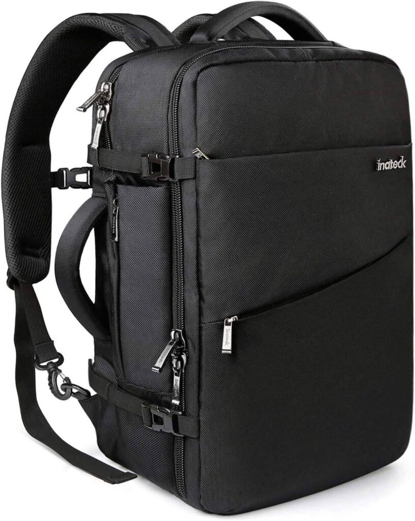 Inateckバッグはオシャレで機能的な17インチPC・40L仕様で、ビジネスや旅行に最適です。50cmの長手方向の内寸は他にない特徴で、書類やPC収納に便利ですが、仕切りのため実際の収納スペースはやや限られます。