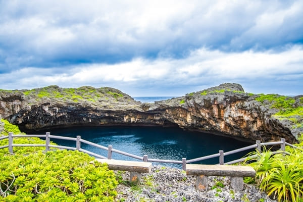 ダイビングスポットとして有名な場所である通り池。青い色の穴になっていることで、ブルーホールと呼ばれています。