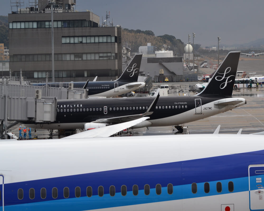 羽田と九州地方を中心に離着陸している黒い飛行機のスターフライヤー。北九州線に次いで主力空港となる福岡空港へ毎日 便が運航しています。
