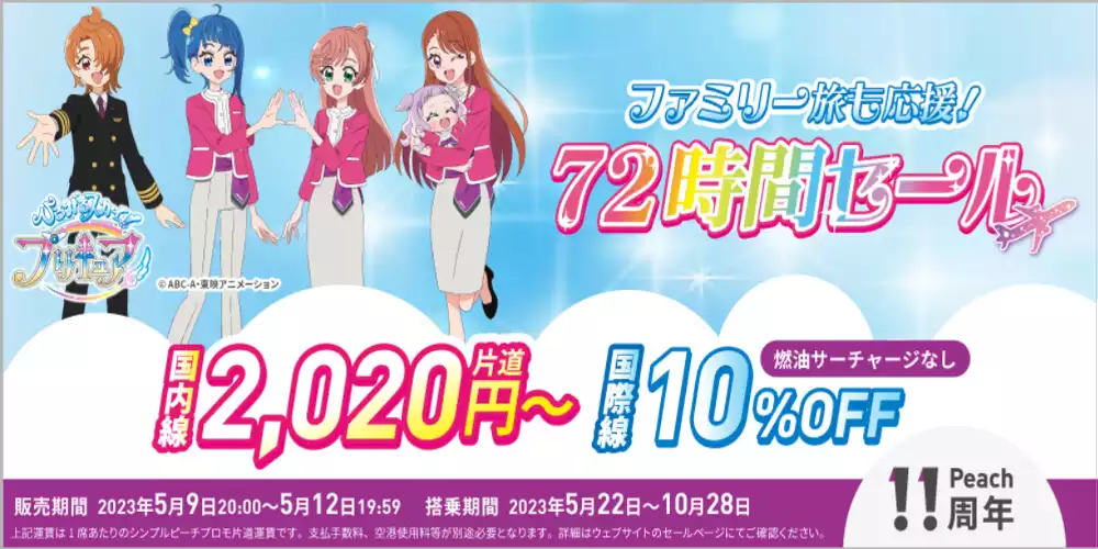 2023年5月9日午後8時からピーチセールにてプリキャアとのコラボを記念したセールが開催されます。ピーチセールの期間は5月12日までの72時間セールです。