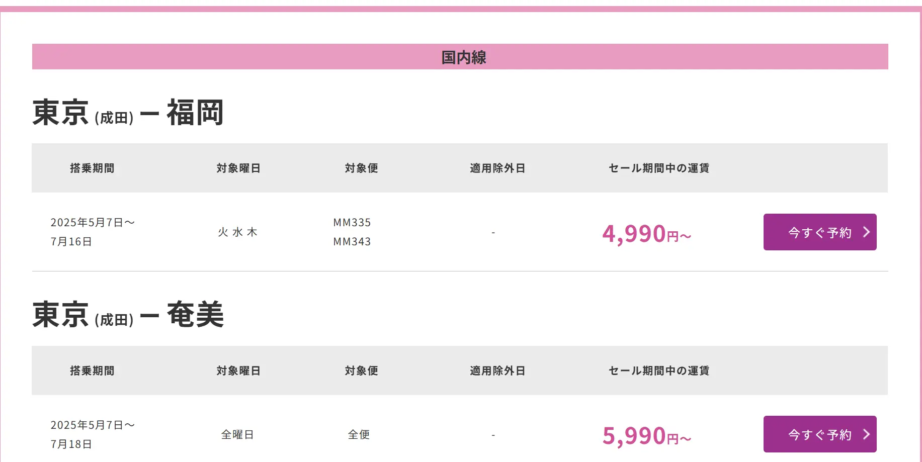 今回のピーチの国内線セールは、2025年4月10日12:00から4月13日23:59までの期間限定で開催されています。主な路線の料金例は以下の通りです。