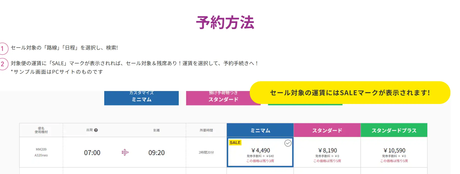 ※注意事項:セール運賃の販売席数には限りがあり、売り切れ次第終了となります。また、表示されている運賃は片道あたりの金額で、支払い時に各種手数料や税金が加算されます。