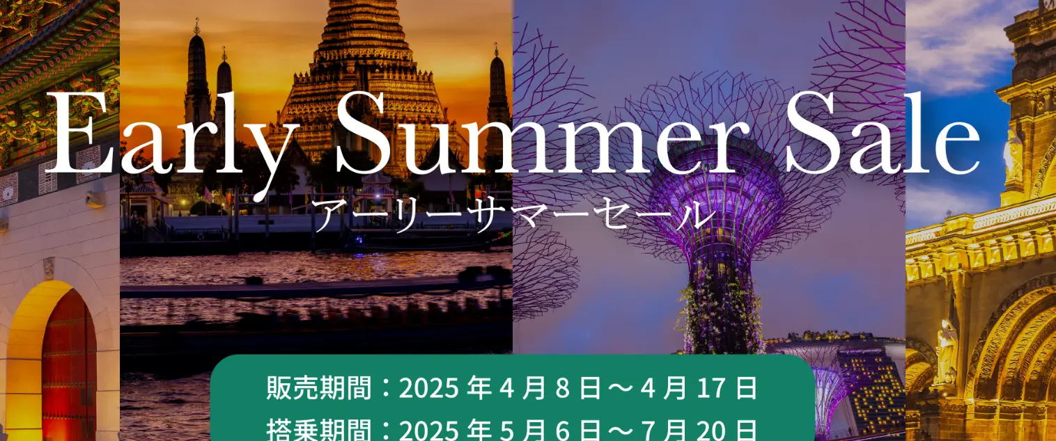ZIPAIRが2025年の夏に向けて「Early Summer Sale(アーリーサマーセール)」を開催中です。このタイムセールでは、アジア各国への格安航空券が手に入るチャンスです。セール期間は限定されているので、海外旅行を計画している方は、この機会をお見逃しなく!