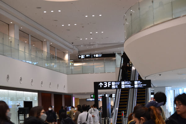 1階でチェックインを完了させたら、エスカレーターに乗って2階へ向かいましょう。福岡空港の2階には、北と南の保安検査場があります。