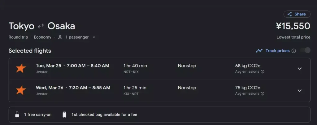 検索同様に簡単で、往復もしくは片道フライトで航空会社を選択して右上部にある「料金をトラッキング」のトグルをオンにするだけです。これにより、価格変動があった時にメールで知らせてくれます。