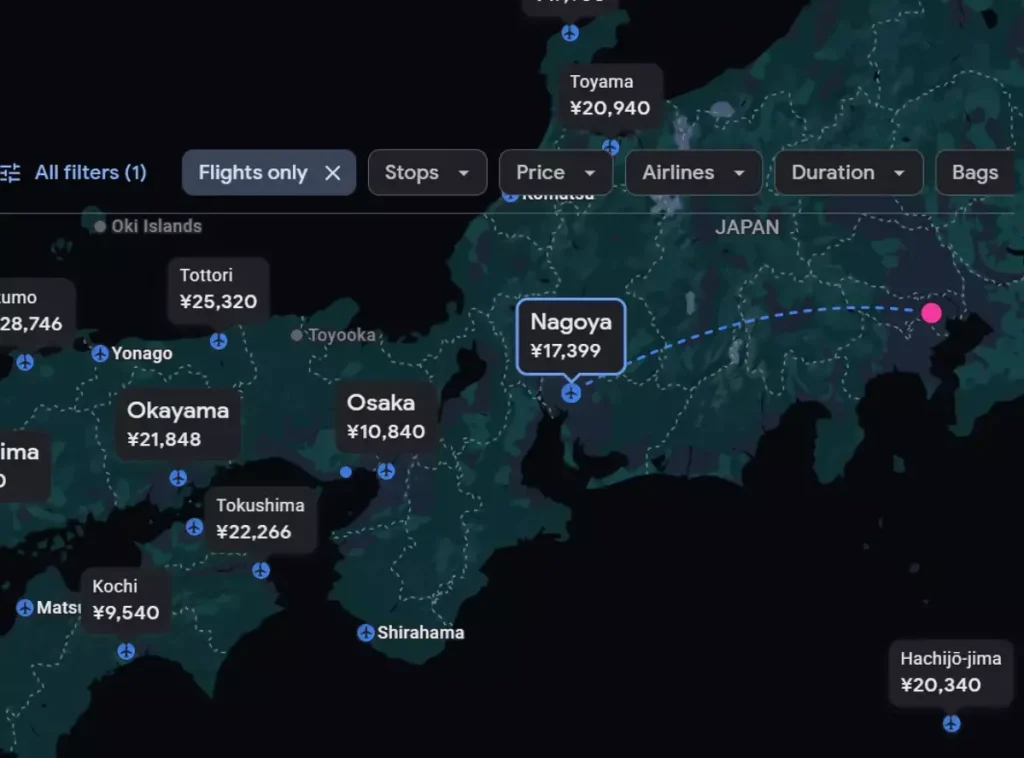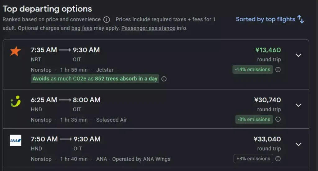 早速検索を行ってみると到着地点を飛行機のマークで表示してくれており、その部分にカーソルを合わせるだけで料金を表示してくれます。ここでは大分を例にしました。