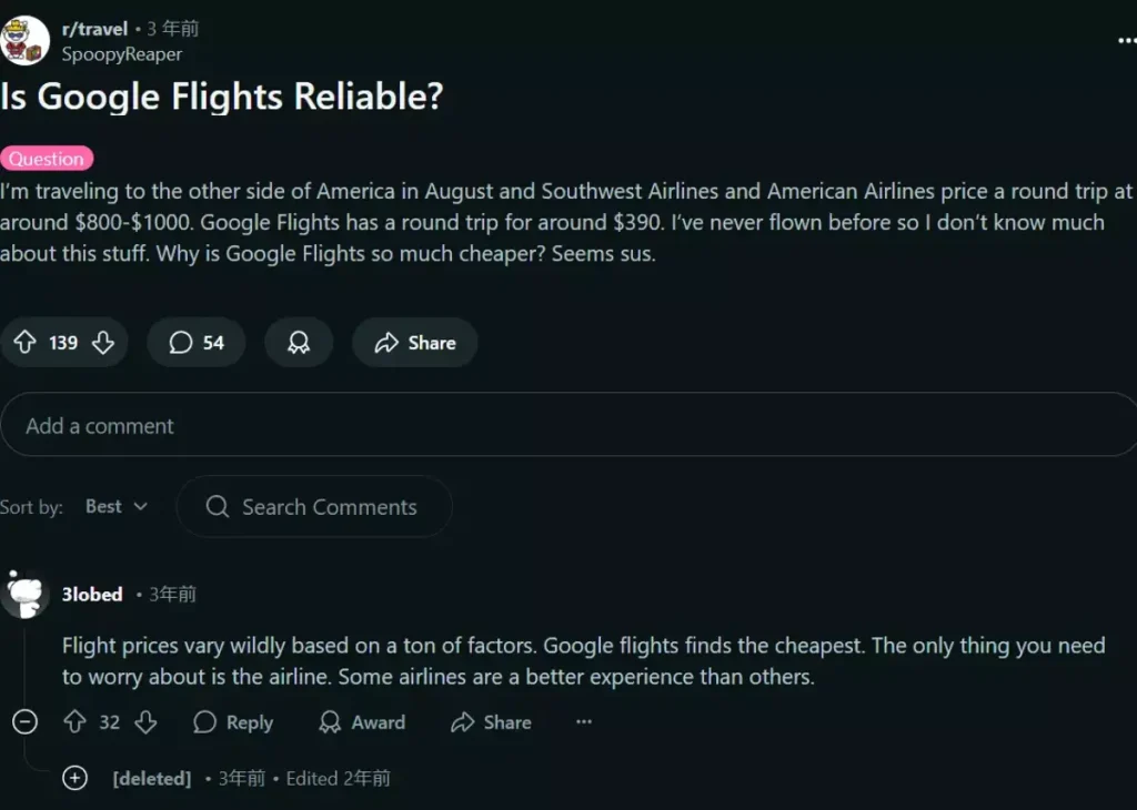 実際に利用者がいるredditで口コミを調べたところ、googleフライトは信頼できると思っている人が数多くいました。googleフライトの良さは多数の航空会社から直接航空券を予約できるところです。